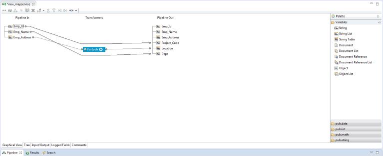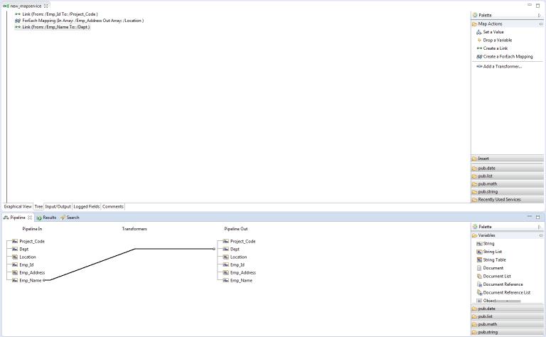 Designer lists map actions from top to bottom. The Graphical Tree tab provides a more condensed view of a map service. When you click on a map action in the map service, the corresponding step is displayed in the Pipeline view.