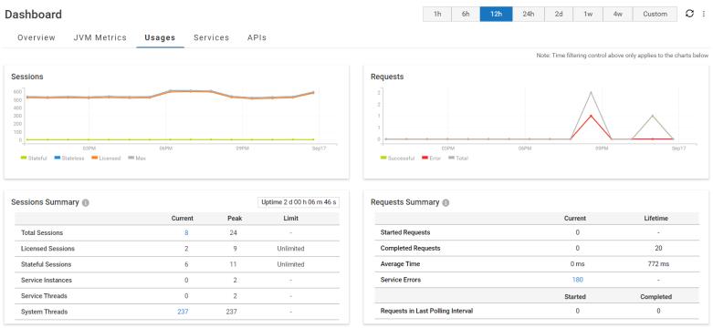 The Usages tab displays the server usage statistics. You can view the consolidated sessions and requests data from all the nodes in a cluster.