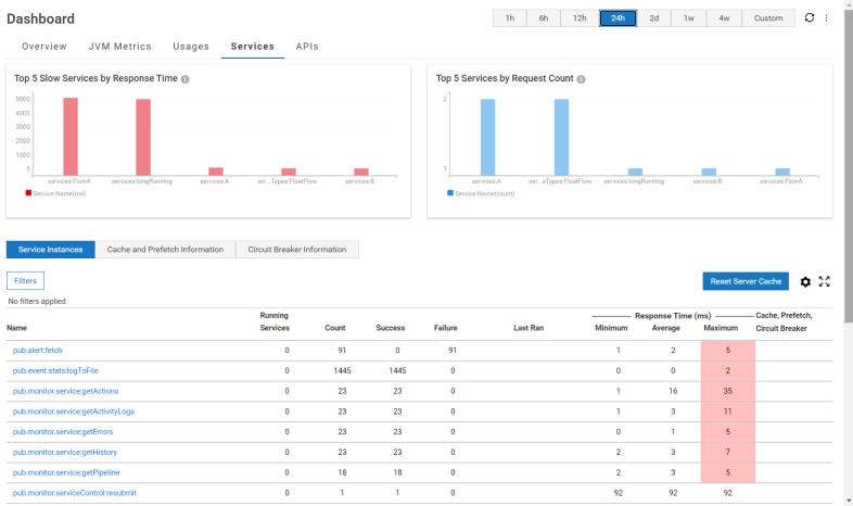 Reset Server Cache | You can reset the server cache to clear the count and restart the data collection timers for all the services. To reset the cache for a specific service, you can use the pub.cache.serviceResults:resetServiceCache service. |