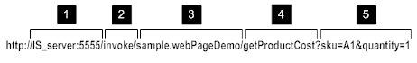5 | Specifies the input values for the service. Specify a question mark (?) before the input values. The question mark signals the beginning of the query string that contains the input values. Each input value is represented as variable=value. The variable portion is case sensitive. Be sure to use the same combination of upper and lower case letters as specified in your service. If your service requires more than one input value, separate each variable=value with an ampersand (&). Note: Only specify the query string portion of the URL when using the HTTP GET method. |