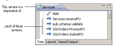 Note:Designer does not consider a Java service that invokes another services to be a dependent. For example, if Java service A invokes service B, and you instruct Designer to find dependents of service B, service A will not appear as a dependent.