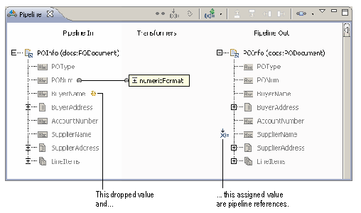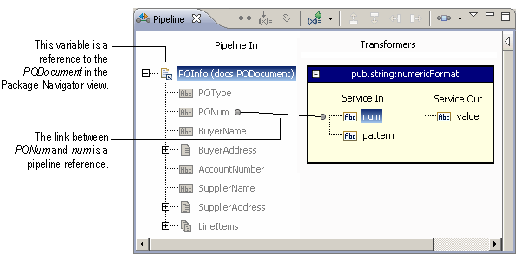 A pipeline reference is where a variable in a document reference or document reference list in Pipeline view is linked to another variable, assigned a value, or dropped. For example, in its input signature, ServiceA declares a document reference to the IS document type PODocument. If ServiceA contains an INVOKE or MAP step in which a variable in the document reference is linked to another pipeline variable, then that link is a pipeline reference. In the following illustration of the Pipeline view, the link between PONum and num is a pipeline reference.