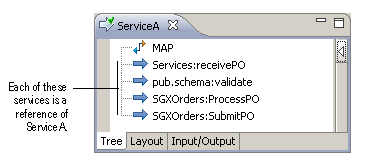 To determine how a selected element uses other elements on the server, you can find references of the selected element. A reference is an element that is used by a selected element. For example, the flow service ServiceA invokes the services receivePO, pub.schema:validate, processPO and submitPO. Additionally, in its input signature, ServiceA declares a document reference to the IS document type PODocument. The services receivePO, validate, ProcessPO, and SubmitPO, and the IS document type PODocument, are used by ServiceA. The elements receivePO, validate, ProcessPO, SubmitPO, and PODocument are references of ServiceA.