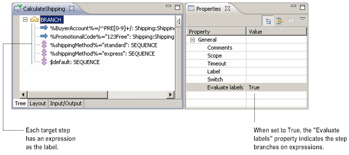 2. In the Properties view for the BRANCH step, set Evaluate labels to True.