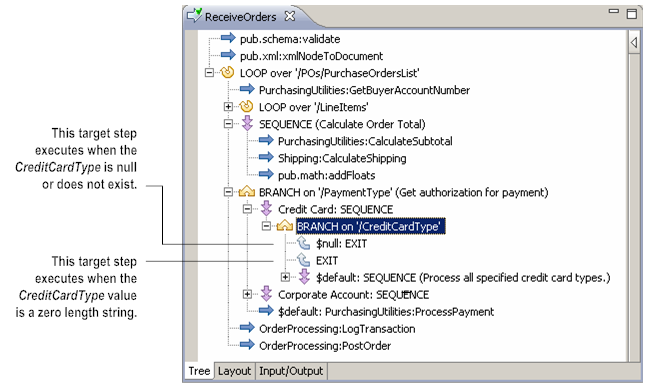 The following example shows a BRANCH step used to authorize a credit card number based on the buyer’s credit card type (CreditCardType). It contains three target steps. The first target step handles situations where the value of CreditCardType is null or where CreditCardType does not exist in the pipeline. The second target step handles cases where the value of CreditCardType is an empty string. (Note that the first two target steps are EXIT steps that will return a failure condition when executed.) The third target step has the $default label, and will process all specified credit card types.