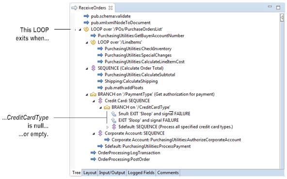 The following flow service contains two EXIT steps that, if executed, will exit the nearest ancestor LOOP step. If the value of CreditCardType is null or an empty string, the matching EXIT step executes and exits the LOOP over the '/POs/PurchaseOrdersList' step.