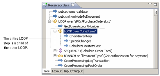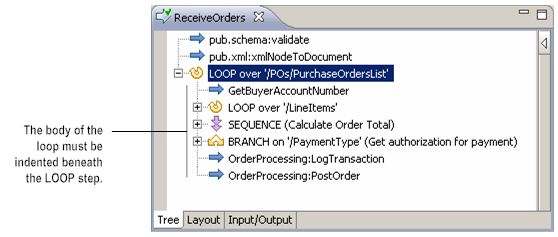 The LOOP step repeats a sequence of child steps once for each element in an array that you specify. For example, if your pipeline contains an array of purchase-order line items, you could use a LOOP step to process each line item in the array.