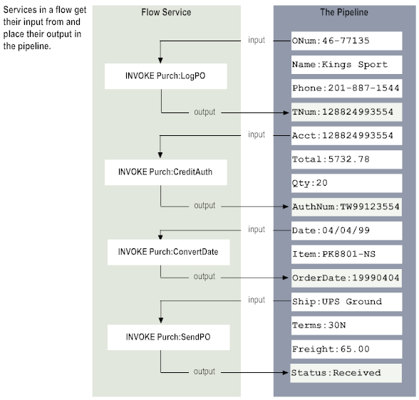 The pipeline starts with the input to the flow service and collects inputs and outputs from subsequent services in the flow. When a service in the flow executes, it has access to all data in the pipeline at that point.