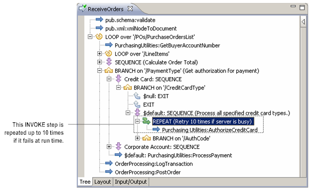 Re-execute (retry) a set of steps if any step within the set fails. This option is useful to accommodate transient failures that might occur when accessing an external system (for example, databases, ERP systems, web servers, or web services) or device.