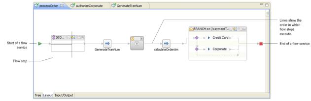 The following illustration identifies the basic elements of a flow service in the Layout tab.