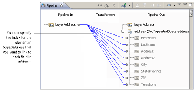 For example, suppose that a buyer’s address information is initially stored in a String List. However, the information might be easier to work with if it were stored in a Document. To map the information in the String List to a Document, create a link between the String List and each field in the Document. Then, specify an index value for each link. In the following pipeline, the elements in buyerAddress String List are mapped to the address Document.