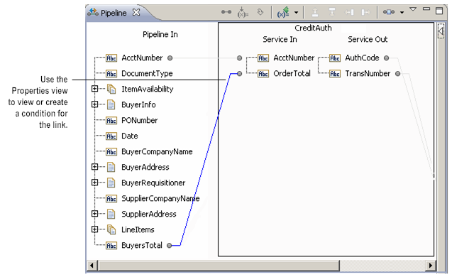 A condition consists of one or more expressions that you write using the syntax that Designer provides. An expression can check for the existence of a variable in the pipeline, check for the value of a variable, or compare a variable to another variable. For example, in the following service, you might want to link the BuyersTotal variable in Pipeline In to the OrderTotal variable in Service In only if the BuyersTotal has a value that is not null. After you link two variables, you would edit the properties and add the condition that needs to be true.