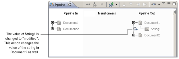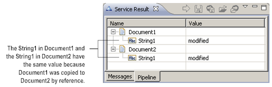 In Step 3, the value of the String1 in Document1 was set to “modified.” However, the value of String1 in Document2 changed also. This is because in Step 2 of the flow service, the value of Document1 was copied to Document2 by reference. Changes to the value of Document1 in later flow steps also change the value of Document2.