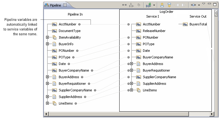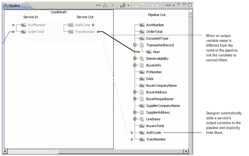 Within a flow, Designer implicitly links variables whose names are the same and whose data types are compatible. For example, the service in the following flow takes a variable called AcctNumber. Because a variable by this name already exists in Pipeline In, it is automatically linked to the AcctNumber variable in Service In. Designer connects implicitly linked variables with a gray link.