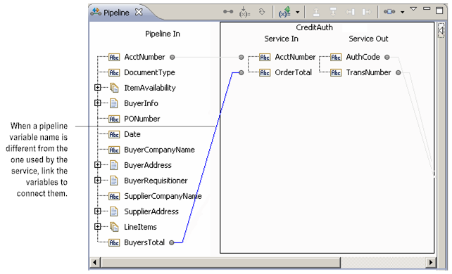 In cases where the services in a flow do not use the same names for a piece of information, use the Pipeline view to explicitly link the variables to each other. Explicit linking is how you accomplish name and structure transformations required in a flow. Designer connects explicitly linked variables with a solid black line.