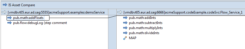 Designer displays the asset whose fully qualified name appears first in ascending order from A to Z on the left side of the Content panel. For example, when comparing a service named folder.subfolder:aaa to a service named folder.subfolder.zzz, the folder.subfolder:aaa always appears on the left side of the Content panel.