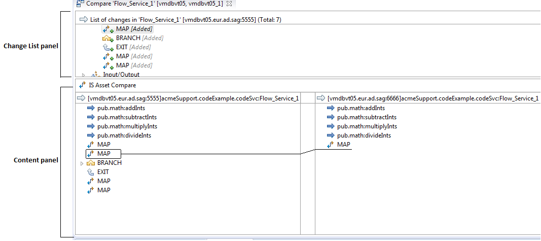 You can open the compare editor using the Compare Element(s) With command available when you right click on an element in the Package Navigator view. If you select one element in the tree, you can compare it with an identically named element on a different Integration Server. You can also select two elements of the same type on the same server or different servers and compare them with each other. Designer shows the differences between the two items that you select in a compare editor as shown in the following example: