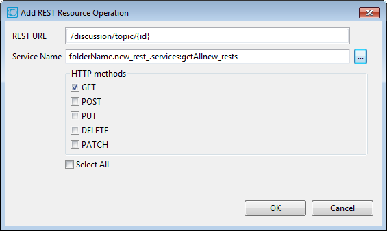 If you select an existing Integration Server service named communication to implement the specified resource operation, ensure that the service has a String input variable which corresponds to the dynamic parameter provided in the REST URL (in this case, id).