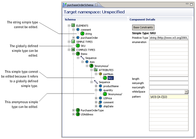 You can edit any of the globally defined simple types (those that appear under the SIMPLE TYPES heading) or anonymous simple types (those defined as part of an element or attribute declaration.) A named simple type that appears as a child of an element or attribute in the Schema browser cannot be edited. (These simple types are global simple types used to define the element or attribute they appear under.) The following illustration identifies the simple type definitions that you can and cannot edit.