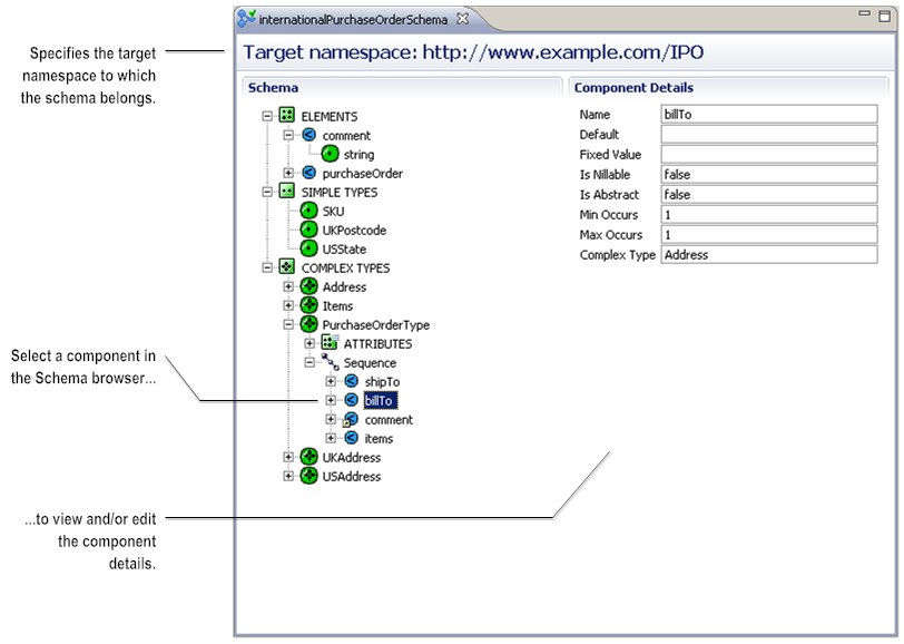 When you select an IS schema in Package Navigator view, Designer displays the contents of the IS schema in the editor. The schema editor is divided into two areas: the Schema browser on the left and the Component Details on the right. Above these areas, the editor identifies the target namespace for the IS schema.