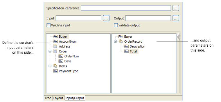 You declare the input and output parameters for a service using the Input/Output tab. On the left side of this tab, you define the variables that the service requires as input. On the right side, you define the variables the service returns to the client or calling program.