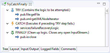 In the following example flow service, a TRY step executes the pub.file:getFile service followed by the pub.xml:getXMLNodeIterator service. If either service throws a service exception, Integration Server exits the TRY step and evaluates the CATCH step to determine if it handles the thrown exception. Regardless of the success of the TRY step, whether the CATCH step handles the thrown exception, or whether a failure occurs during execution of the CATCH step, Integration Server executes the FINALLY step which includes the pub.io:close service to close an open InputStream.