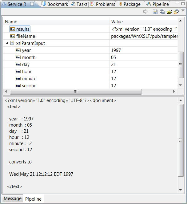 The service uses the style sheet to transform the XML data from the source file specified in filename, converts the data into an XML string, and puts the string in the pipeline as the results parameter. The service also generates the name/value pairs and puts them in the xslParamOutput document. The Results view will display results similar to the following: