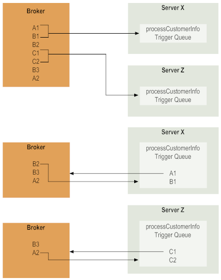 For example, suppose that a cluster contains two servers: ServerX and ServerZ. Each of these servers contains the webMethods messaging trigger processCustomerInfo. The processCustomerInfo webMethods messaging trigger specifies serial document processing with a capacity of 2 and a refill level of 1. For each publisher, the cluster must process documents for this webMethods messaging trigger in the publication order. In this example, the processCustomerInfo trigger client queue on the webMethods Broker contains documents from PublisherA, PublisherB, and PublisherC. PublisherA published documents A1 and A2, PublisherB published documents B1, B2, and B3, and PublisherC published documents C1and C2.