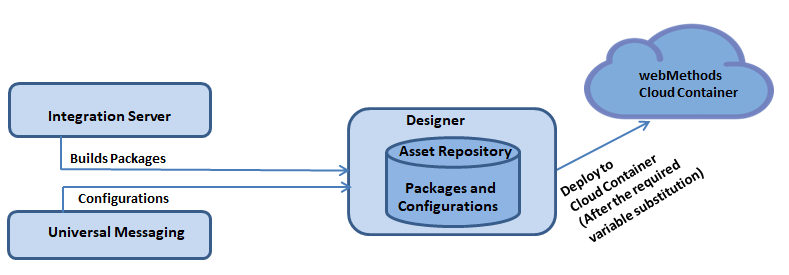 Software AG Designer allows you to deploy the Integration Server packages or configuration assets that you have created, verified, and tested on on-premise Integration Server or Universal Messaging to Cloud Container. When you initiate the deployment from Designer, Integration Server packages and configuration assets are built from Integration Server, and are published to an asset repository present in Software AG Designer.