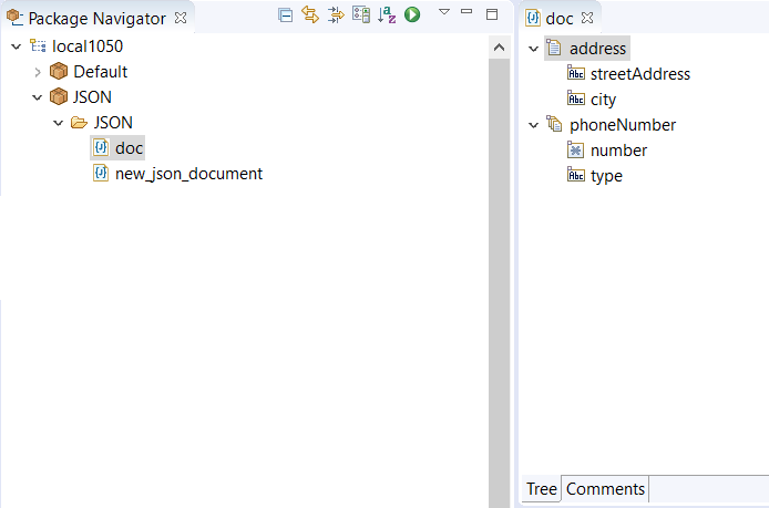 If the JSON folder is selected as the namespace and the text "doc" is provided as the document name while generating the JSON document type for the above schema, the following JSON document type is generated:
