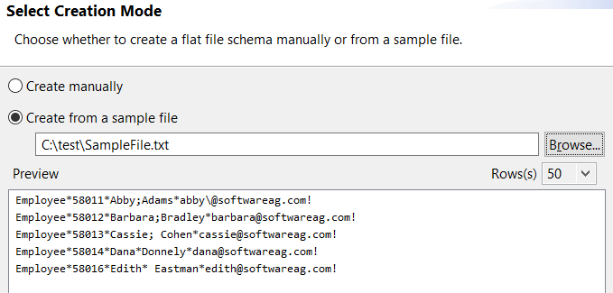 The Preview pane displays the contents of the sample file. You can select the number of rows to be displayed in the Preview pane using the Rows(s) drop down box.