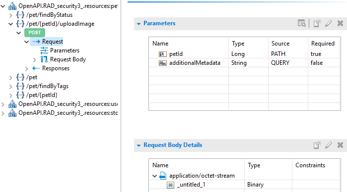 The body of the REST requests lists the media types consumed by the operation, for example, application/json and specifies the schema for each media type. Designer displays the following details for the REST request: