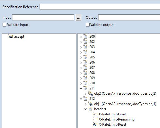 For the response body, Designer displays the output of the service signature containing the document generated for each HTTP code as defined in the OpenAPI document. Integration Server generates the document only if the OpenAPI document contains a response body and/or a header defined for that HTTP code.