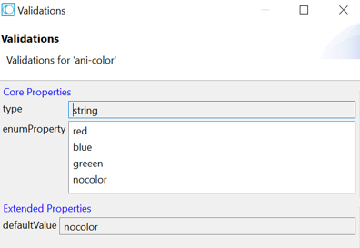 Designer displays the following JSON schema core properties under Core Properties as shown above in the Validations dialog box.