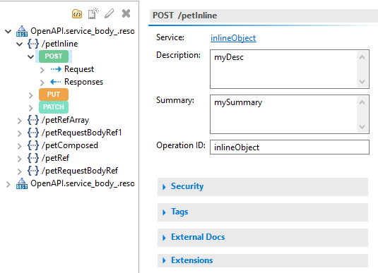 The REST API Descriptor (RAD) displays the REST V2 resources that lists the associated operations. For each operation, Designer displays the REST requests and the responses returned by the operation and the callback services. Designer also displays a link to the service related to the operation. When you click the link, Designer opens the corresponding service in the editor. You can view the description, summary, operation ID, tags, security schemes, and external documents related to the operation.