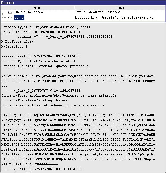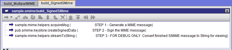 3 | Because you cannot view the contents of an InputStream, this example includes a step that converts SMimeEnvStream to a String so you can examine the finished message with Designer. This technique is useful for testing and debugging. If you examine the contents of string on the Service Result view, you will see a signed S/MIME message similar to the following. Note that this example creates an explicitly signed message—the message is in one body part and the digital signature is in another. ![]() |