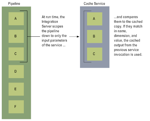 When a cached service has input parameters, at run time Integration Server scopes the pipeline down to only the declared input parameters of the service. Integration Server compares the scoped-down inputs to the previously stored copy of the inputs. If a cached entry exists with input parameters that have the same values, Integration Server returns the cached results from the previous service invocation.