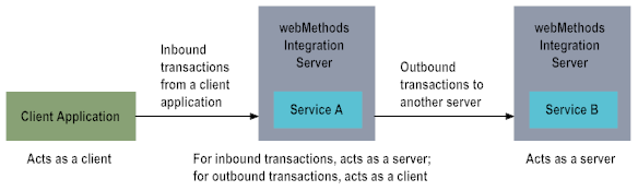 Because an Integration Server can act as either a server or a client in a guaranteed delivery transaction, the guaranteed delivery capabilities of the server handle both inbound transactions and outbound transactions. When a client invokes a service on a server, the server is acting as a server. If a service uses guaranteed delivery to invoke a service on another Integration Server, the server that invokes the service is the client.