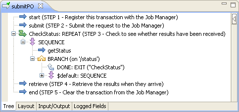 3 | pub.remote.gd:getStatus | Check for results. You can optionally use a REPEAT step to poll the job store and check whether the results from the transaction have been received. This service returns “DONE” when results are available. |