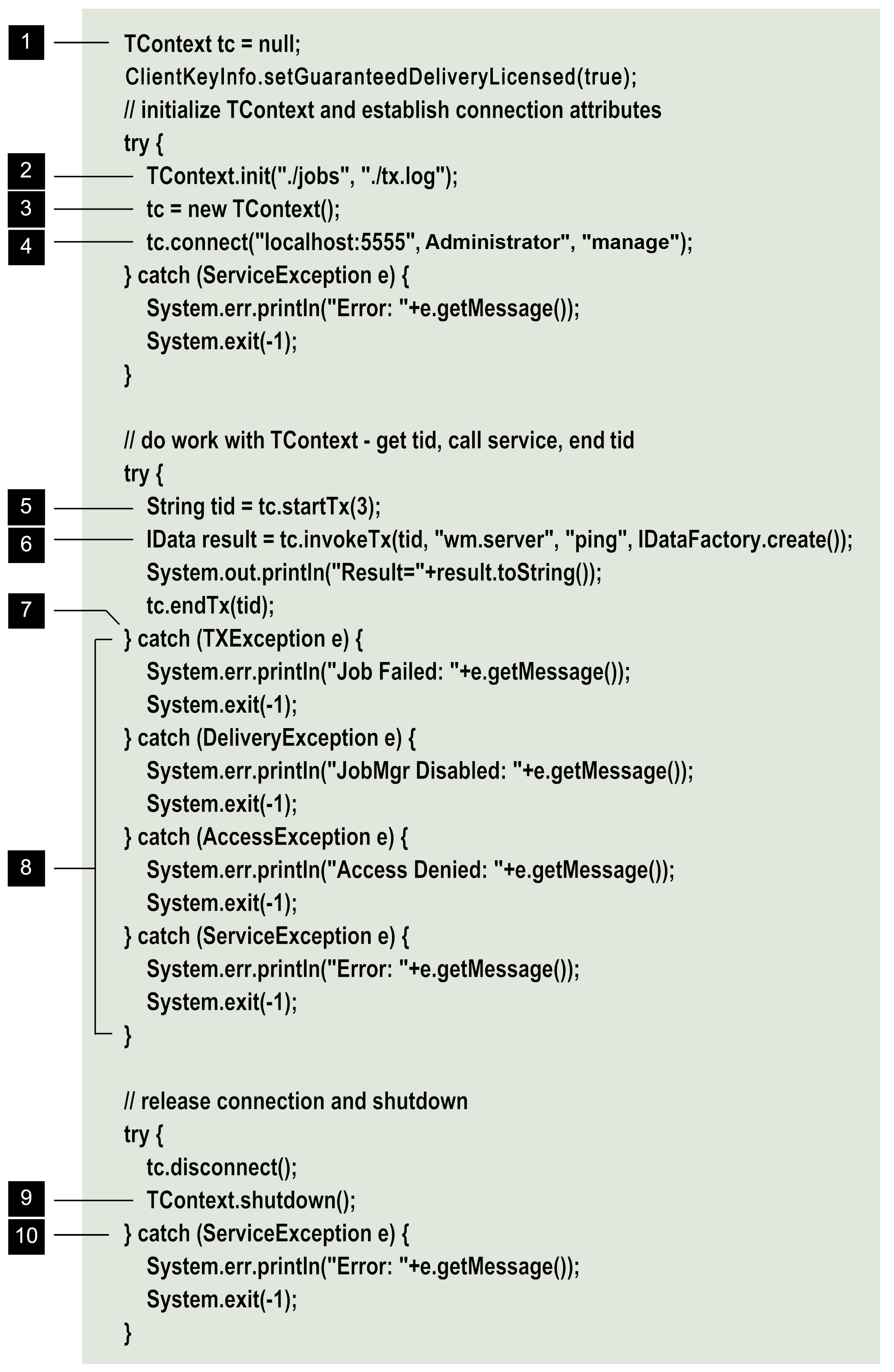 2 | Initialize TContext. | Initialize TContext and specify the job store directory and audit-trail log. The Job Manager starts. Important: Do not include this step if your client will run as a service on a webMethods Integration Server. This function is automatically performed by the server and must not be included in your code. |