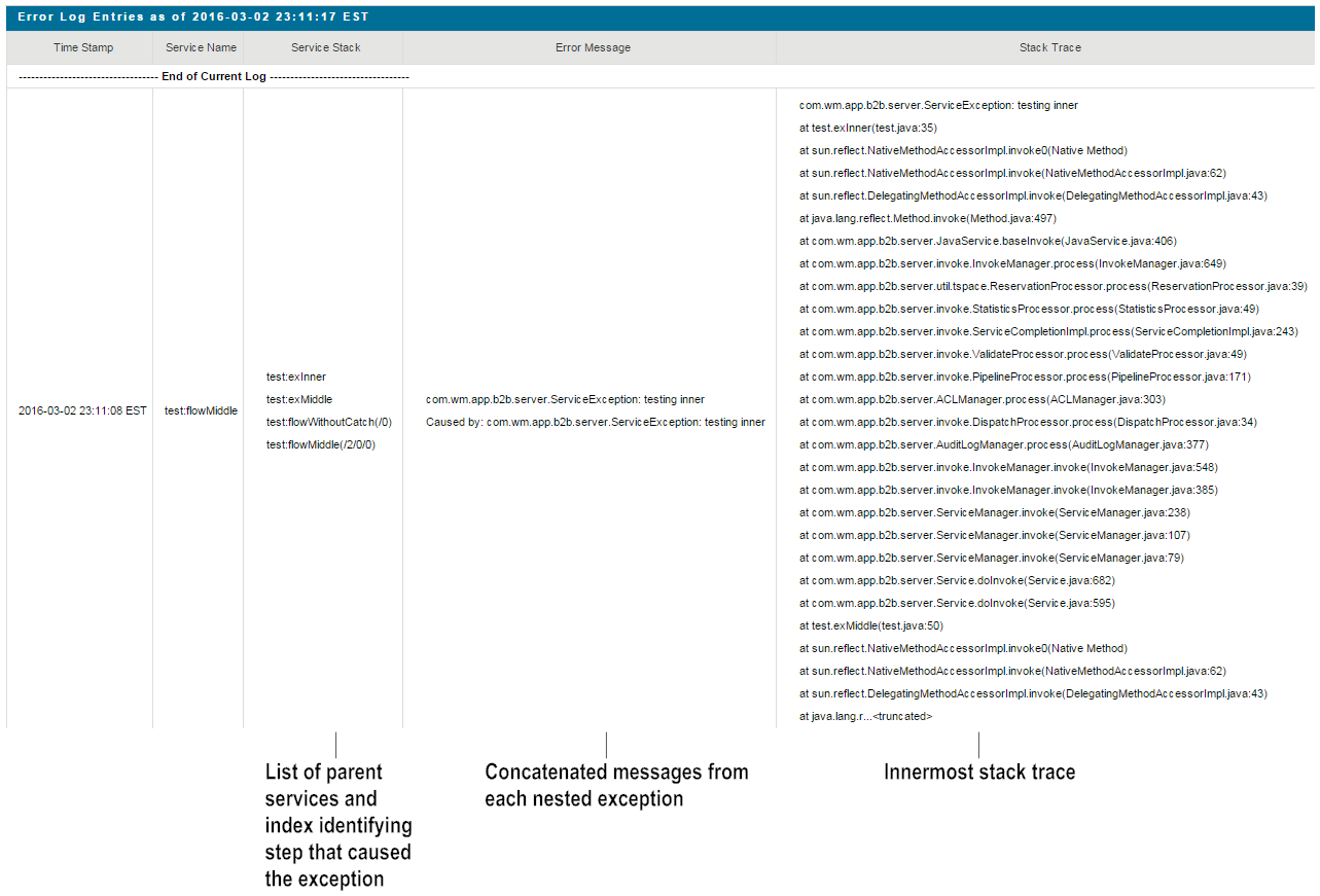 The following image shows a portion of the error log that includes details that help you identify which step caused an exception. The Integration Server Administrator displays these details when you perform two actions:
