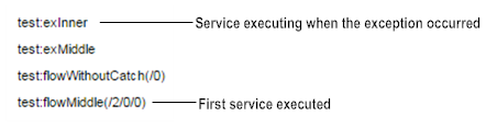 This path helps pinpoint the step at which the exception occurred and is particularly useful when a flow service is called multiple times or when the service or step is deeply nested. For example, suppose serviceA invokes serviceB three times, and the exception occurred at the second invocation of serviceB. The Service Stack column in the error log would show the path as serviceA(/1/2):