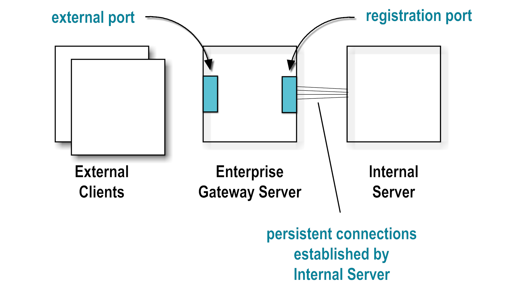 The Integration Server that functions as an Enterprise Gateway Server uses an Enterprise Gateway external port to listen for requests from external clients and an Enterprise Gateway registration port through which it maintains its connection to the Internal Server. For security purposes, the Internal Server initiates the outbound connections to the registration port.