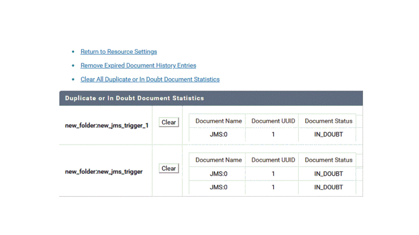 You can use the Integration Server Administrator to view a history of the In Doubt or Duplicate documents received by triggers. The Integration Server Administrator displays the name, UUID (universally unique identifier), and status for the Duplicate or In Doubt documents received by triggers for which exactly-once processing is configured.