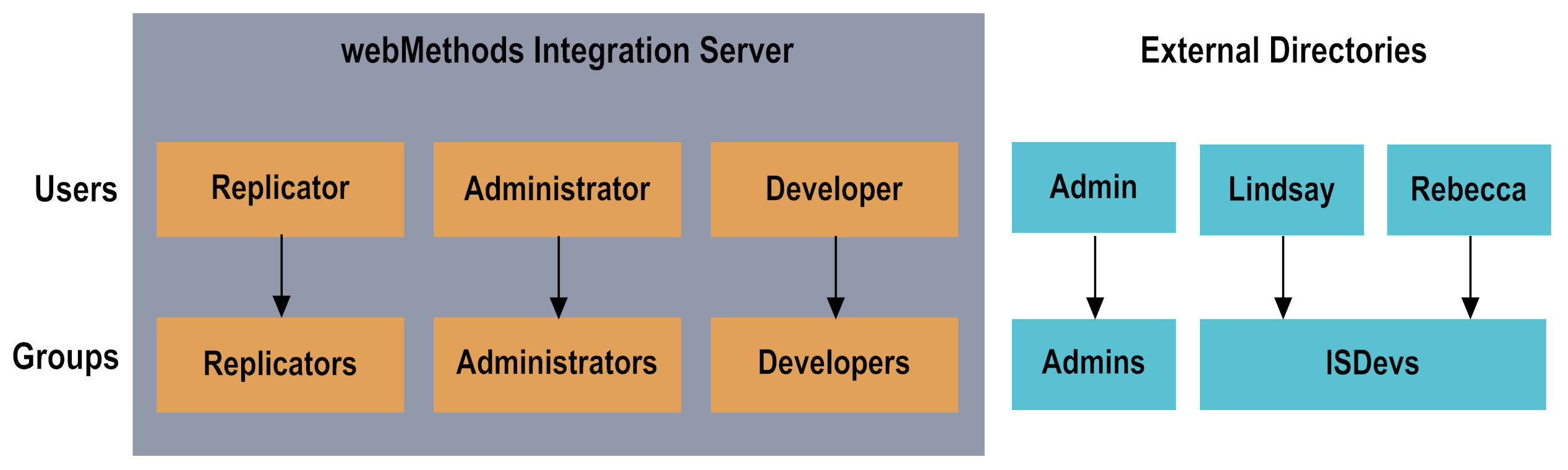 An exception to the above diagram is that all internally-defined users are members of the internally-defined Everybody group.