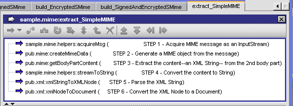 1 | This step acquires a MIME message. This example calls a helper service that puts a three-part test message in the pipeline as an InputStream. In a production solution, it is more likely that a MIME message would be passed into the pipeline by a content handler or a back-end system. |
