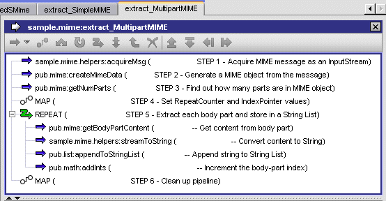 1 | This step acquires a MIME message. This example uses a helper service that generates a three-part MIME message and puts it in the pipeline as an InputStream call envStream. In a production solution, it is more likely that a MIME message would be passed into the pipeline by a content handler or a back-end system. | ||