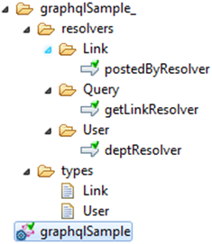 If you import the above schema with name graphqlSample. Here, Link object has a field which is of object type User, so Integration Server generates a resolver service postedByResolver under graphqlSample_/resolvers/Link folder. User type has field dept with input argument, so Integration Server generates a resolver service deptResolver under graphqlSample_/resolvers/User folder.