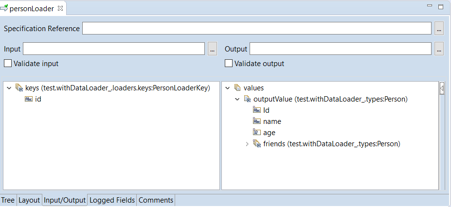 The input value of the loader service is the key value and the output values are the fields for which you need the data. In the above schema, for personLoader loader service, the input value is the id and the output value is of type Person with fields id, name, age, and friends.
