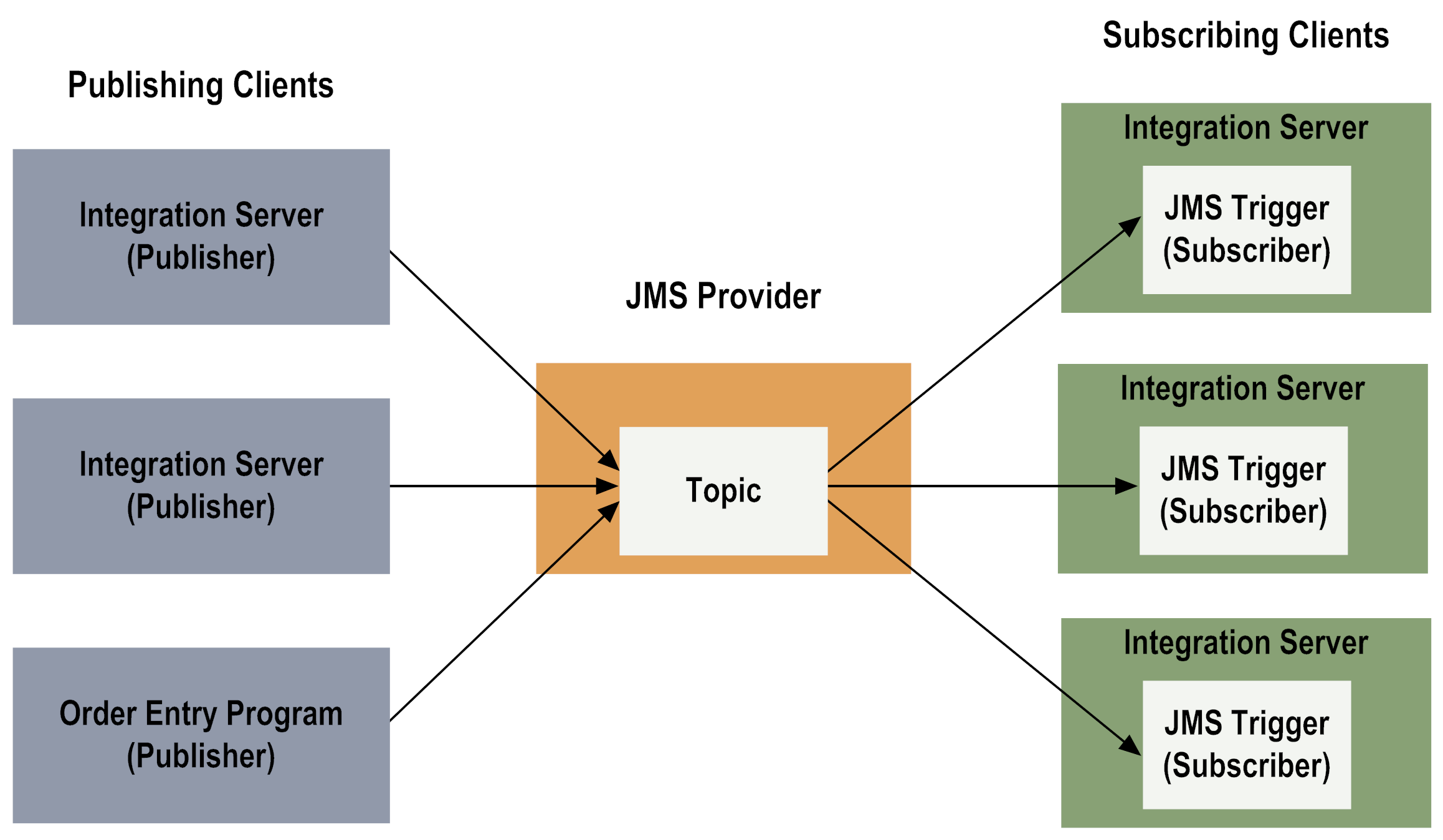 The central concept in the publish-subscribe messaging is a destination called a topic. Message publishers send messages of specified topics. Clients that want to receive that type of message subscribe to the topic.